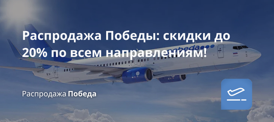 Авиакомпания Победа запустила новую распродажу. Билеты со скидкой до 20% по всем направлениям. Размер скидки зависит от даты покупки. Покупать на сайте авиакомпании, а искать проще на агрегаторах: aviasales и Яндекс путешествия.
