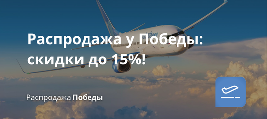 Авиакомпания Победа запустила «распродажу». Билеты со скидкой 10% на тариф Базовый, 15% на тарифы с багажом — Выгодный и Максимум. В этот раз на многие направления цены были завышены перед распродажей, но проверить свои стоит.