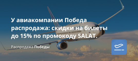 У авиакомпании Победа распродажа: скидки на билеты до 15% по промокоду SALAT.